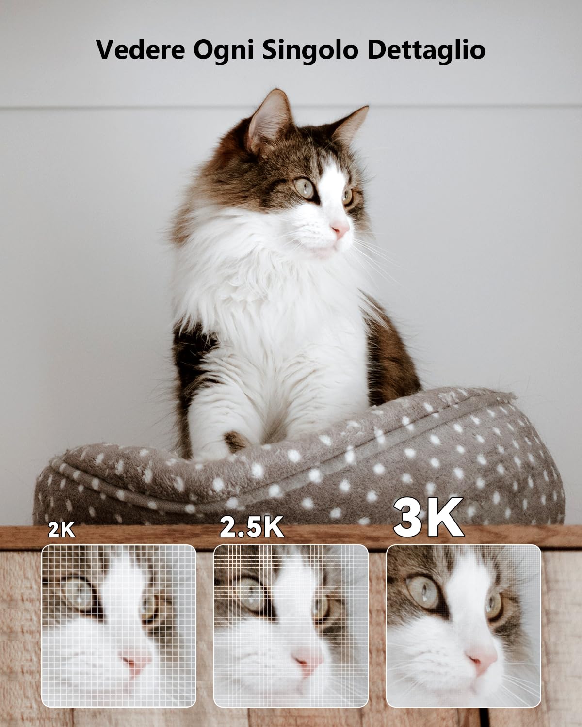 - 【5MP Vista Panoramica a 360°& Allarmi di Suoni Anomali】 Grazie alla copertura del campo visivo orizzontale di 355° e rotazione verticale di 85°, crea una copertura di 360°, possiamo posizionarla dove vogliamo e visualizzare l'intera stanza, e la telecamera da interno invia avvisi istantanei al smartphone ogni volta che rileva un bambino che piange o altri suoni anomali, tenendoci consapevole di quello che sta succedendo a casa.