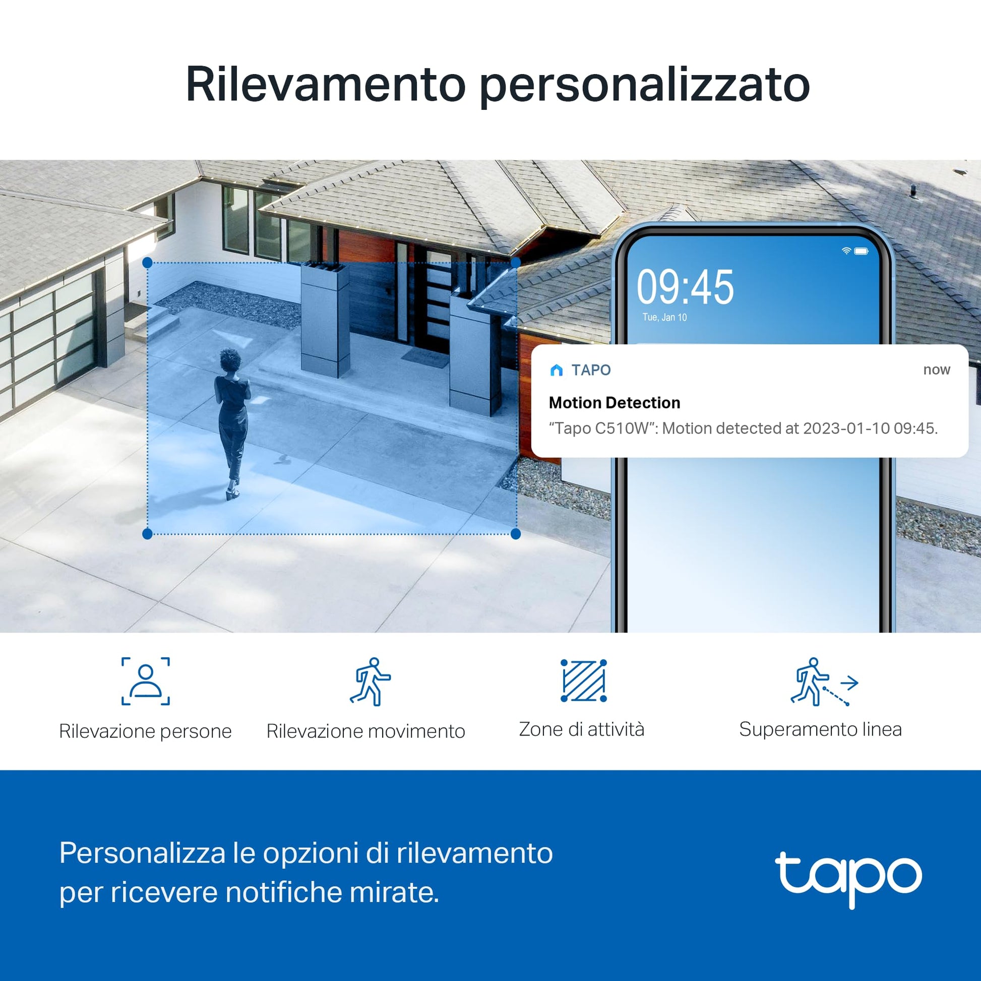 - Smart Motion Tracking-Tapo C510W tiene traccia del movimento con rotazione ad alta velocità, assicurandoti di tenere d'occhio le aree più vitali.